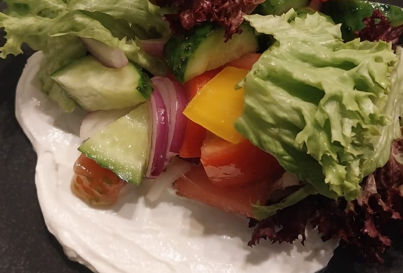 Огурец, помидор, перец, ялтинский лук, салат, мусс с фетой.
