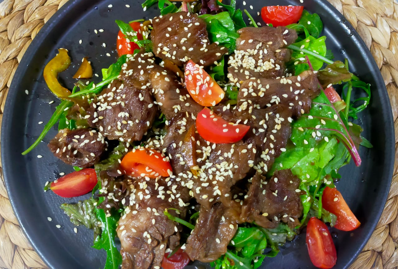 Говядина, микс салатов, черри, перец болгарский, кунжут, соус с бальзамиком